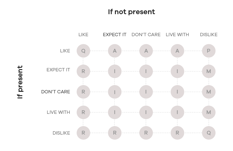 This matrix determines whether a feature is "Must-Have", "Performance", "Attractive", or "Indifferent".